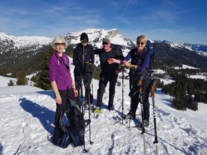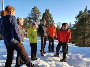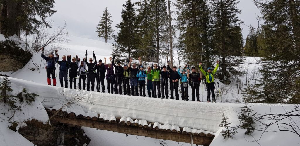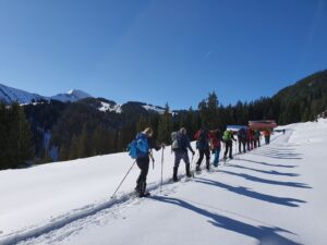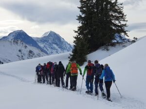 Kurz vor zehn Uhr standen alle mit Sack und Pack auf ihren Schneeschuhen parat. Der erste Teil des Abstieges führte die beiden Gruppen auf gemeinsamer Strecke zum Allgäuli, danach zur Brücke über den Leimbach und von dort hinab zu den Langlaufloipen, hier trennten sich dann die Wege Richtung Kemmeribodenbad und Lombachalp. Während die Route für die Kemmeribodenbad-Fraktion über eine Strecke von 10.4 km Länge mit 76 m Auf- und 810 m Abstieg führte, meisterte die Lombachalp-Crew eine Strecke von 6.9 km Länge mit 106 m Auf- und 352 m Abstieg.