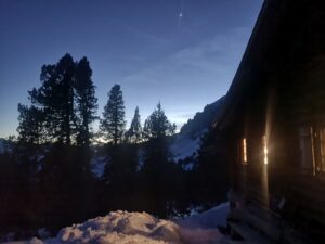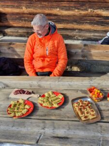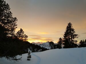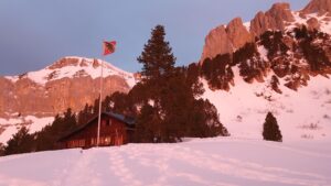Am Sonntag wurden die Teilnehmenden des GCE-Schneeschuhcamps schon früh mit einem besonderen Naturschauspiel beglückt und in den erwachenden Tag begleitet: Ein Morgenrot der Extraklasse verzauberte die Landschaft, es liess alle Betrachter einfach nur staunen und geniessen! In der Hohganthütte wurde später ein Frühstück aufgetischt, das kaum Wünsche unerfüllt liess: Brot, Züpfe, Butter, Konfitüre, Honig, Käse, Aufschnitt, Kaffee, Tee und ein Rest Fruchtsalat vom Vorabend standen im Angebot, welchem gebührend und dankend zugesprochen wurde. Denn allen war klar, dass nach den anschliessenden Aufräum- und Putzaktivitäten in der Hohganthütte der Abstieg zu den Ausgangsorten im Kemmeribodenbad oder auf der Lombachalp auf dem Programm stand.