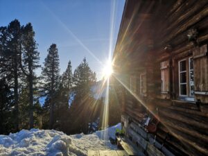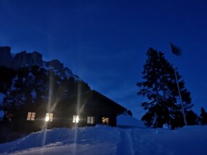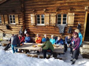 Am frühen Nachmittag trafen die naturbegeisterten Emmentaler fast zeitgleich aus entgegengesetzter Richtung am Ziel ein. Wenig später war die Hütte bezogen, die Fensterläden geöffnet, das Feuer im Küchenherd entfacht und der Ofen im Aufenthaltsraum eingeheizt. Fleissige Hände zauberten aus den herbeigeschleppten Nahrungsmitteln einen köstlichen Apéro auf den Tisch, vor der Hütte installierte sich eine gesellige Runde, die sich intensiv unterhielt und die durstigen Kehlen mit allerlei Getränken befeuchtete. Ja, sogar ein ominöses Fläschchen «Salatsosse» wurde schalkhaft herumgereicht!