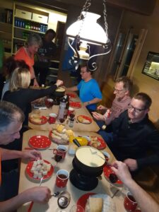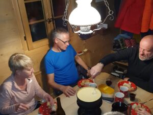 Nachdem sich die Sonne hinter dem Hohgant zu verstecken begann, die Lufttemperatur rasch kühler wurde, der Wind auffrischte und das beeindruckende Bergpanorama von allen ausgiebig genossen worden war, begaben sich die Naturbegeisterten ins Innere der Hütte. An den Tischen wurde geplaudert, gescherzt oder intensiv gespielt, während sich die Kulinarik-Truppe unter der Leitung von Kari und Margrit in der Küche ans Werk machte, um ein köstliches Hüttenfondue zuzubereiten. Die randvoll gefüllten Caquelons liessen keine Zweifel aufkommen: selbst die hungrigsten Gäste würden gesättigt werden können. Mit heissem Tee, veredeltem Traubensaft, Mineralwasser oder Quöllfrischem aus der Ostschweiz wurde der Durst gestillt. Frischer Fruchtsalat, Margrits Spitzbuben und Nussstängel wurden zum Kaffee serviert. Herrlich!